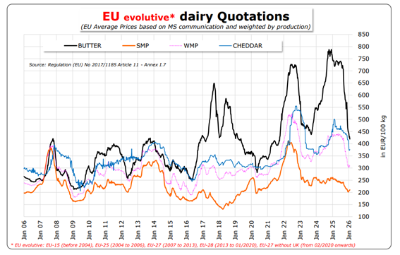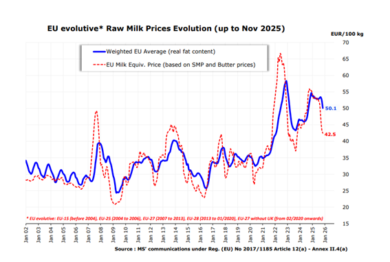 Los últimos datos publicados por la Comisión Europea, a través del Milk Market Observatory, y que recoge la nueva edición del barómetro del sector lácteo de FeNIL, muestran que, a partir del segundo semestre de 2025, se produjo una corrección significativa en los precios de las principales commodities lácteas en la Unión Europea, con descensos especialmente acusados en referencias como la mantequilla y las leches en polvo. Esta evolución se ha ido trasladando progresivamente al precio de la leche pagado a los ganaderos en los distintos Estados miembros, reflejando un proceso de reequilibrio entre oferta y demanda.